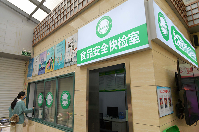 2021年12月7日,在江西省南昌市東湖區賢士花園農貿市場,市民將剛購買的蔬菜送檢。2021年,東湖區在全區11個農貿市場建成食品安全快速檢測室,對市民送檢樣品中的農藥殘留、瘦肉精、甲醛等11種有害物質進行免費現場快速檢測,守護群眾“舌尖上的安全”。新華社記者 彭昭之 攝