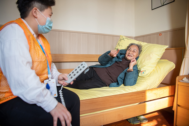 2021年12月2日,在重慶市渝北區仙桃街道養老服務中心,陳佩蘭老人(右)在護理員陳傲的幫助下體驗使用“智能護理床”。新華社記者 唐奕 攝