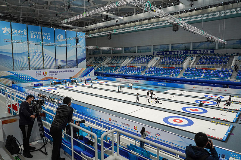 2021年4月6日,運動員在冰壺項目測試活動中。2022年北京冬奧會將國家游泳中心“水立方”改造為“冰立方”,用作冰壺項目比賽場館,有效減少建設投資,更讓夏奧場館煥然新生,拓展多元賽后經營能力。新華社記者 彭子洋 攝