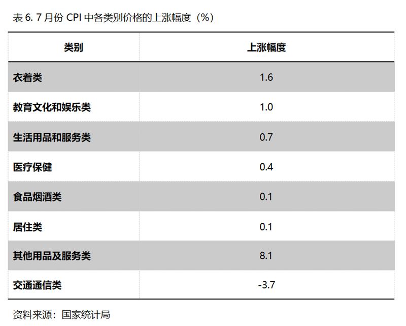 7月份,在CPI 8個類別中有7個類別保持上漲,1個類別下降。上漲的7個類別包括衣著類價格同比上漲1.6%,教育文化和娛樂類上漲1.0%,生活用品及服務類上漲0.7%,醫療保健類上漲0.4%,食品煙酒類上漲0.1%,居住類上漲0.1%,其他用品和服務類上漲8.1%;下降的雖然就交通通信類1個類別,但降幅仍還比較大,7月份同比下降3.7%。