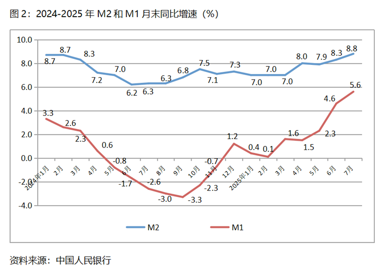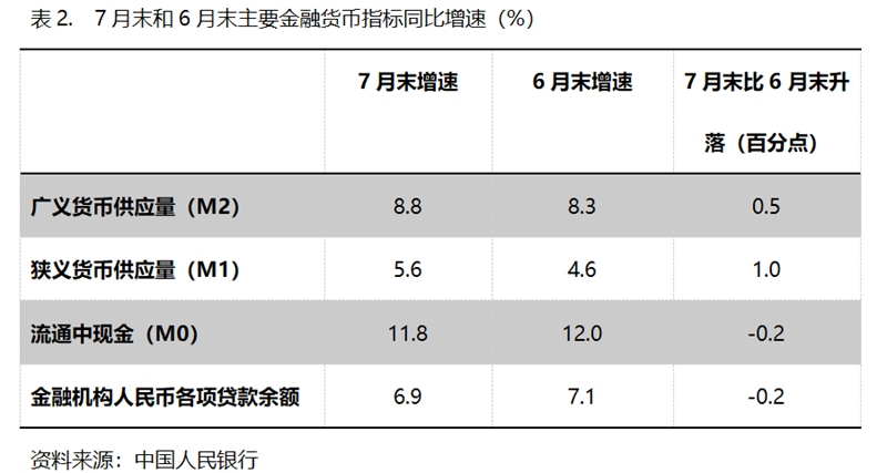 (二)M2增速持續回升。7月末,廣義貨幣供應量(M2)同比增長8.8%,比6月末增長8.3%回升0.5個百分點,6月末增速比5月末7.9%的增速回升了0.4個百分點,保持了持續回升勢頭;狹義貨幣供應量(M1)同比增長5.6%,比6月末增長4.6%回升1.0個百分點,6月末增幅比5月末2.3%增幅回升2.3個百分點;流通中貨幣(M0)增速持續小幅回落,7月末同比增長11.8%,比6月末增長12.0%回落0.2個百分點,而6月末增速比5月末增速回落0.1個百分點。7月末M2和M1增速的持續回升,M0增速的基本持平,表明貨幣政策仍在向適度寬松方向的要求運行, M1緩慢的增長仍需要給予高度關注。