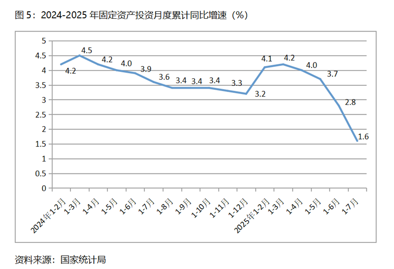 (三)投資增速持續回落。1-7月份,固定資產投資同比增長1.6%,比1-6月份增長2.8%回落了1.2個百分點,1-6月份增速比1-5月份增長3.7%回落了0.9個百分點,增速呈現出持續的回落。1-7月份國有控股投資同比增速比1-6月份回落1.5個百分點;民間投資降幅擴大了0.9個百分點。三次產業投資中,第一產業投資增速回落0.9個百分點,第二產業投資增速回落1.3個百分點,第三產業投資降幅擴大1.2 百分點。固定資產投資增速較大幅度的持續回落,需引起宏觀調控的高度重視。