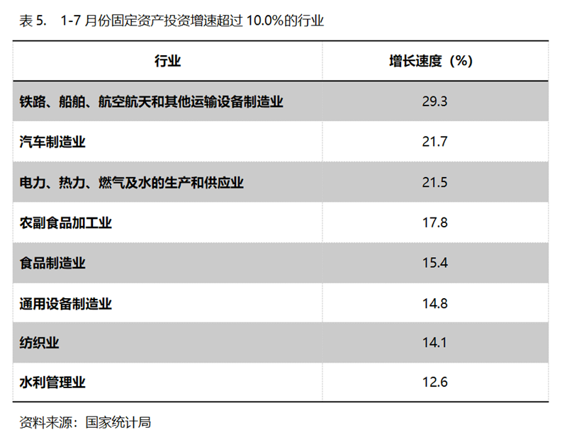 1-7月份,固定資產投資增速超過10.0%的主要行業共8個,即鐵路、船舶、航空航天和其他運輸設備制造業增長29.3%,汽車制造業增長21.7%,電力、熱力、燃氣及水的生產和供應業增長21.5%,農副食品加工業增長17.8%,食品制造業增長15.4%,通用設備制造業增長14.8%,紡織業增長14.1%,水利管理業增長12.6%。
