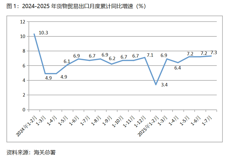 (一)貨物出口增速由平轉升。1-7月份,貨物出口同比增長7.3%,比1-6月份增長7.2%回升0.1個百分點,1-6月份與1-5月份持平,增速呈現出由平轉升的態勢。貨物出口對主要貿易出口經濟體增速有升有平也有落,1-7月份對歐盟出口同比增長8.2%,比1-6月份7.9%增速回升0.3個百分點;對美國出口下降11.6%,比1-6月份下降9.9%擴大1.7個百分點;對東盟出口增長14.8%,比1-6月份14.3%增速回升0.5個百分點;對拉丁美洲出口增長8.4%,與1-6月份8.4%增速持平;對非洲出口增長25.9%,比1-6月份23.0%增速回升2.9個百分點。面對較為復雜嚴峻的國際形勢,出口增速由平轉升,充分說明我國出口有著較強的韌性。
