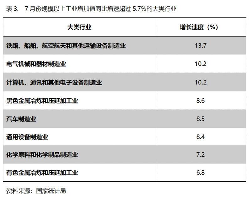 7月份,增長速度超過規模以上工業增長5.7%的主要大類行業共有8個,即鐵路、船舶、航空航天和其他運輸設備制造業同比增長13.7%,電氣機械和器材制造業增長10.2%,計算機、通訊和其他電子設備制造業增長10.2%,黑色金屬冶煉和壓延加工業增長8.6%,汽車制造業增長8.5%,通用設備制造業增長8.4%,化學原料和化學制品制造業增長7.2%,有色金屬冶煉和壓延加工業增長6.8%。