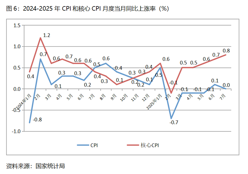 (四) CPI漲幅比上月回落。7月份,CPI同比漲幅持平,比6月份上漲0.1%回落0.1個百分點, 自3月份以來一直保持在-0.1-0.1%區間,持續呈現低位運行態勢。7月份,核心CPI同比上漲0.8%,比6月份上漲0.7%上升了0.1個百分點。雖然核心CPI漲幅保持回升的態勢,經濟運行活力有所增強,但漲幅也十分有限,加之CPI一直處于較低水平,經濟運行活力仍較為偏弱,宏觀政策更加積極和寬松仍十分必要。